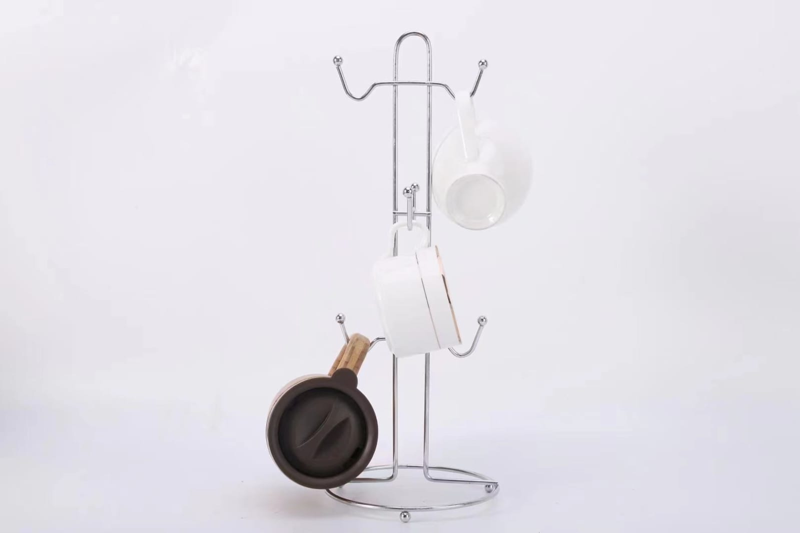 - Our mug holder is made of durable, galvanized chrome metal. Branches tilt up to hold cups securely, and each end has a circular knob to help hold cups in place.